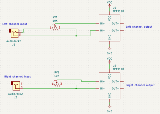 [[File:Circuito amplificatore stereo tpa3118.png|640px|miniatura|destra|Schematica del circuito dell'amplificatore]] | |||